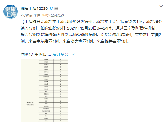 2021年12月29日0—24时,通过口岸联防联控机制,报告17例新增境外输入性新冠肺炎确诊病例。新增治愈出院5例,其中来自美国2例,来自塞尔维亚1例,来自澳大利亚1例,来自格鲁吉亚1例。