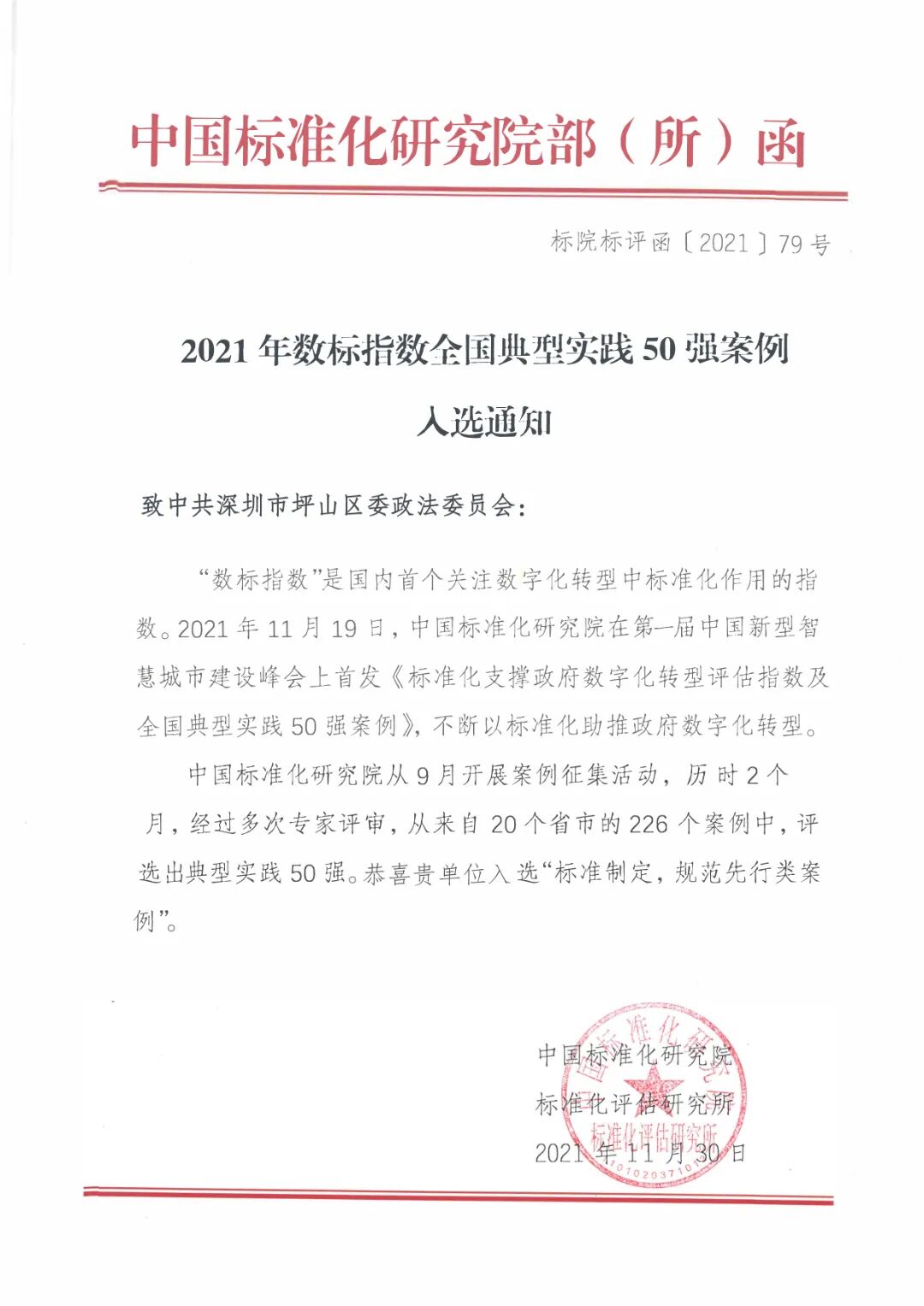 近日,中国标准化研究院在第一届中国新型智慧城市建设峰会上首发《标准化支撑政府数字化转型评估指数及全国典型实践50强案例》,经过专家多次评审,从来自20个省市的226个案例中,深圳市坪山区申报的“块数据+市域社会治理体系”标准化支撑政府数字化转型典型案例成功入选典型实践50强,收录于“标准制定,规范先行类案例”类。