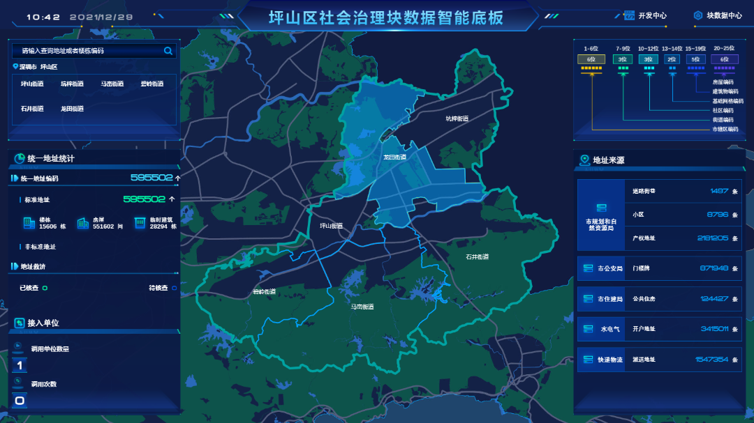 坪山区通过整合多领域资源,运用时空大数据等技术手段打造协同联动运作机制,形成坪山区“块数据+市域社会治理体系”,制定统一地址的社会管理要素标准化,进一步开发“块数据+”社会治理领域示范应用。有效解决了推进智慧城市建设和市域社会治理的工作过程中的三大智能化难题——数据融合聚类难题、地址行业标准互不兼容难题、地址管理和实时更新难题。