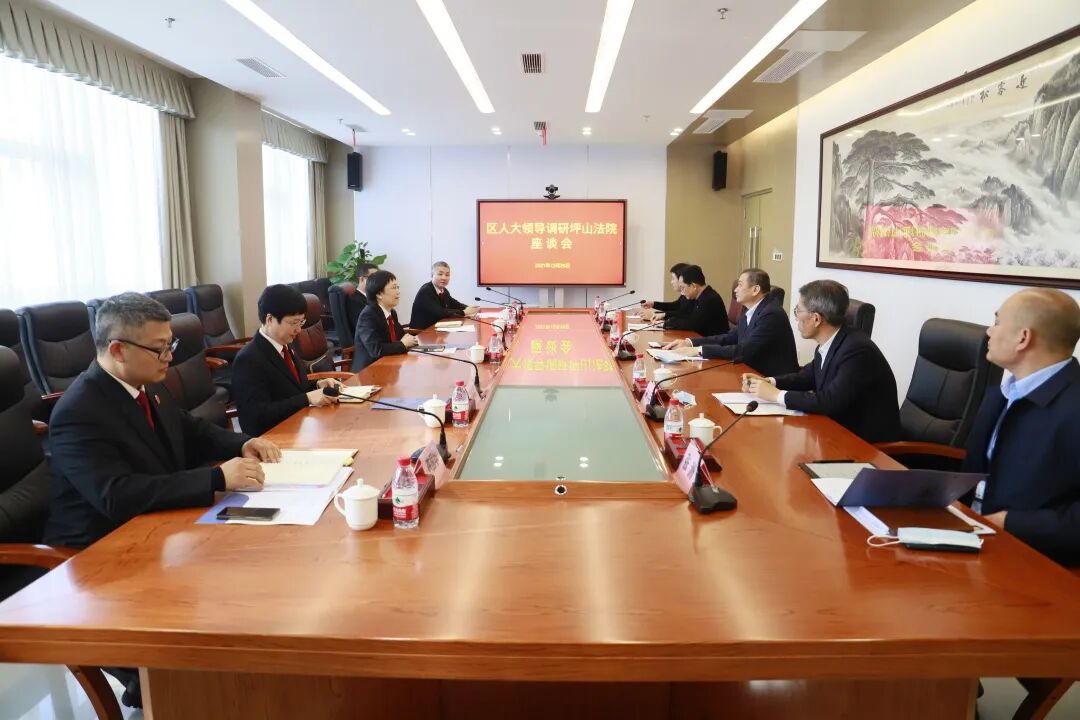视察参观之后,召开了调研座谈会。金闻秀院长介绍了坪山法院基本情况及年底清案、接受人大监督等工作情况,重点从审执质效、服务大局、司法为民、改革创新、队伍建设五个方面详细汇报了坪山法院建院以来的工作情况。区人大常委会与会领导与坪山法院班子成员分别就调研中关注的问题展开了深入交流讨论。
