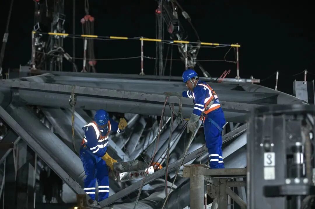 深圳地铁大运综合交通枢纽施工现场在假期这几天不分昼夜、热火朝天地进行着“湾区之舞”雨棚屋盖主桁梁的吊装。