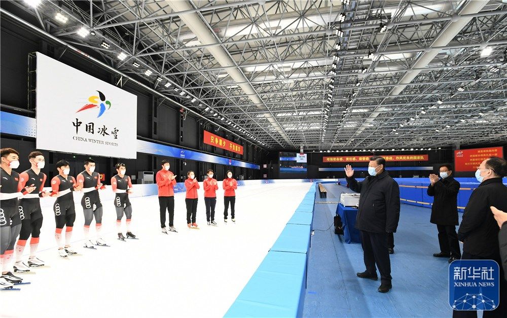 1月4日,中共中央总书记、国家主席、中央军委主席习近平在北京考察2022年冬奥会、冬残奥会筹办备赛工作。这是4日下午,习近平在二七厂冰雪项目训练基地速滑馆,向参训运动员、教练员表示慰问。新华社记者 谢环驰 摄