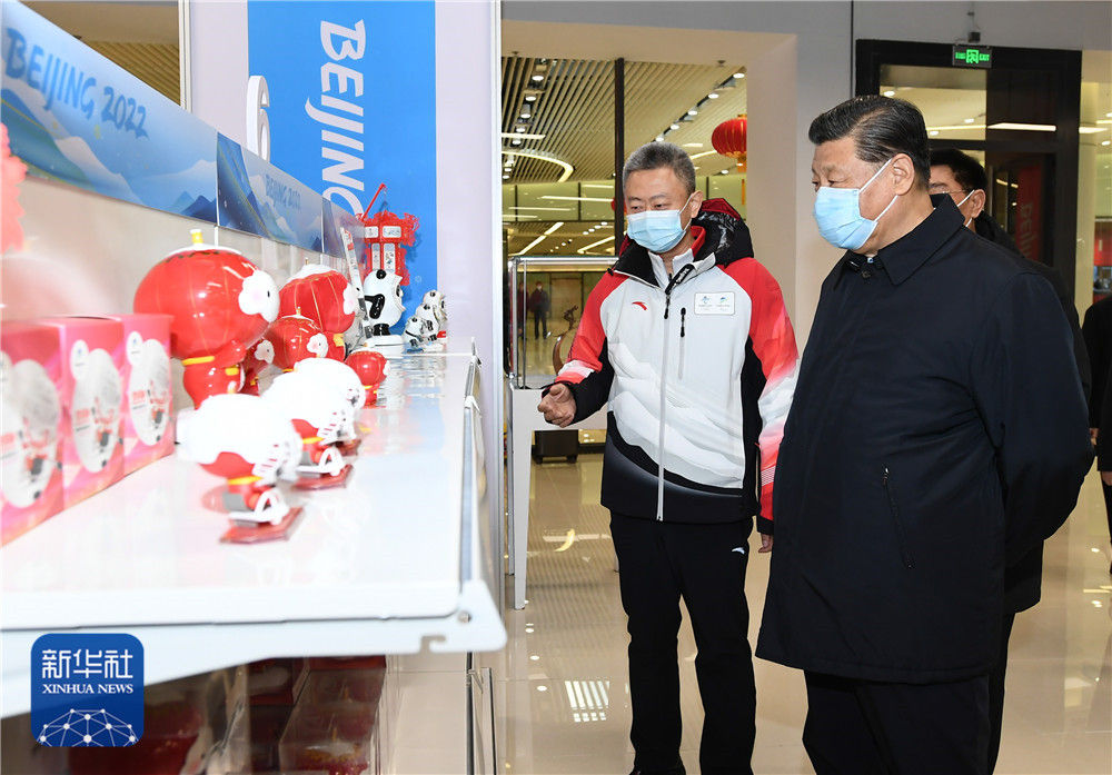 1月4日,中共中央总书记、国家主席、中央军委主席习近平在北京考察2022年冬奥会、冬残奥会筹办备赛工作。这是4日上午,习近平在北京冬奥村(冬残奥村)广场区察看官方特许商品零售店。新华社记者 谢环驰 摄