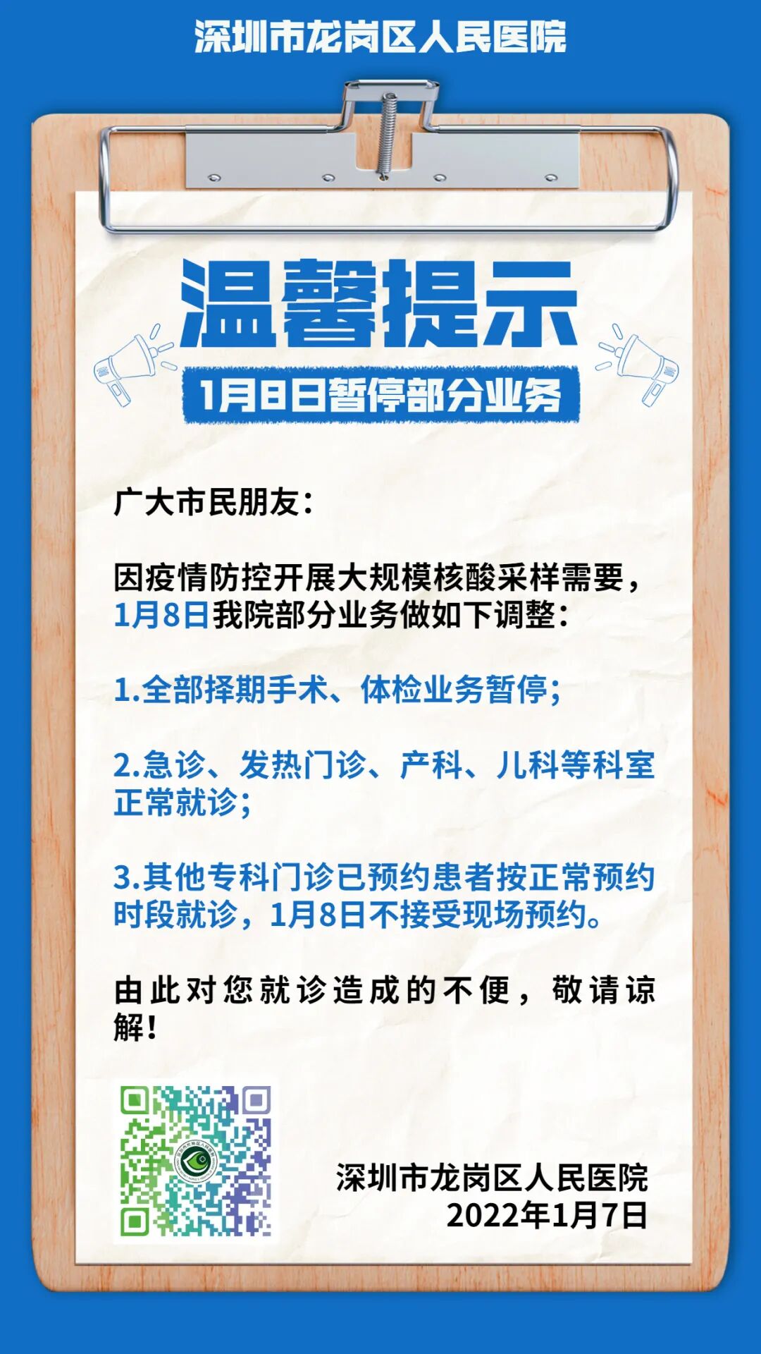 记者从美年大健康体检中心获悉,接到龙岗区坂田卫生监督分所通知,今天坂田美益康分院停诊,请已预约今天体检的人员改约其他时间,坂田周边地区人员暂不能去其他分院体检,请知悉。
