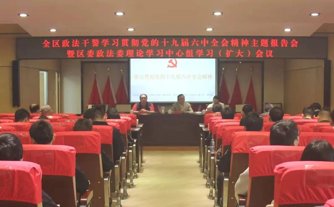 2022年1月6日,坪山区政法干警学习贯彻党的十九届六中全会精神主题报告会暨区委政法委理论学习中心组(扩大)会议在区政府四楼会议室召开。