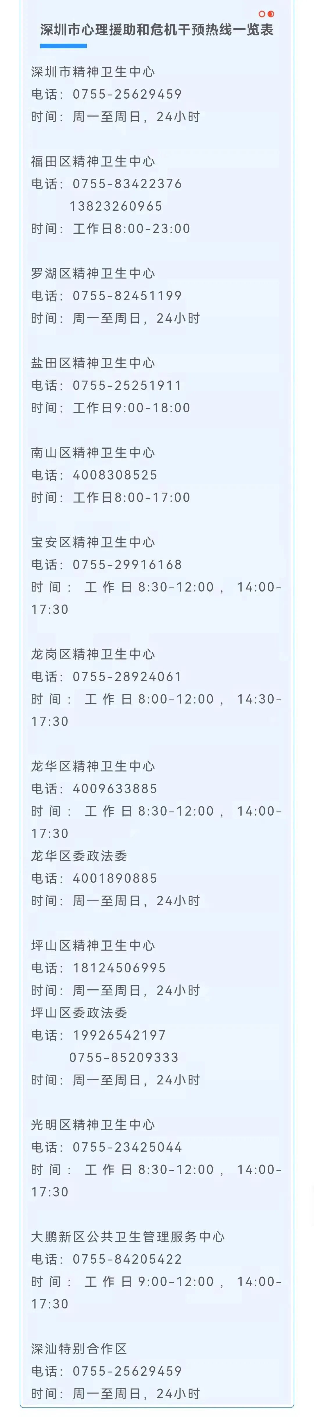 除了隔离点,深圳市在全市公布了心理援助热线电子地图,让市民足不出户、一键拨打“安心热线”,即可获得专业心理辅导。