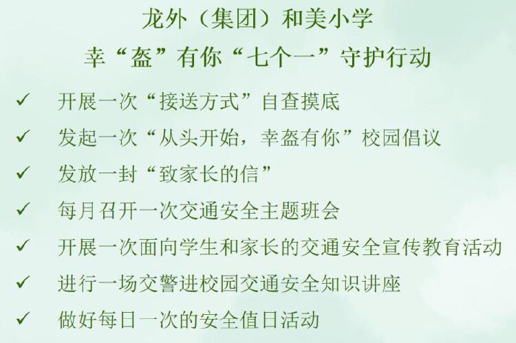 龙外(集团)和美小学相关负责人表示,学校已经将头盔安全纳入了常态化管理,通过实践,学校的安全“绝招”效果良好,家长的安全意识有了明显提高。目前,和美骑行的家长头盔佩戴率已实现动态100%。未来,学校将继续保持做好相关工作,同时也希望学生、家长能够提高安全意识,养成安全习惯,切实做到一盔一带,安全常在!