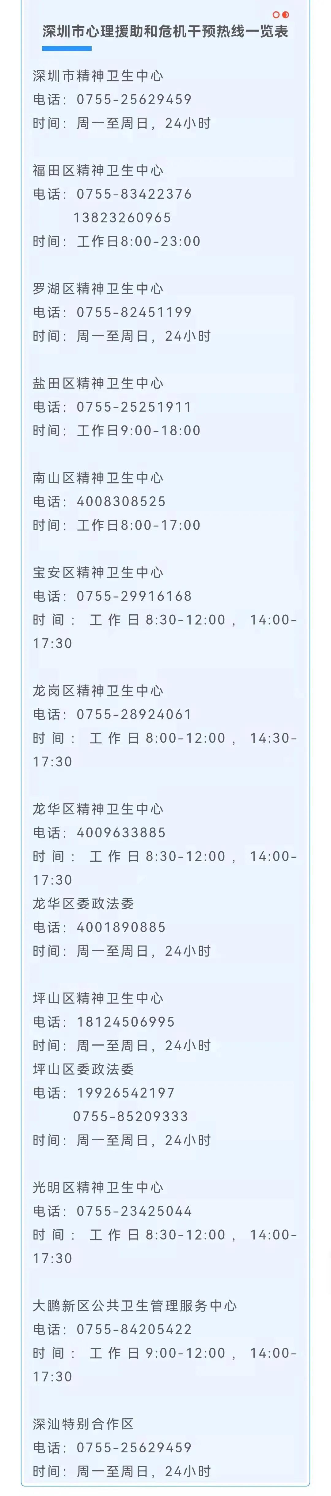 (原标题《深圳市心理援助和危机干预热线一览表》)