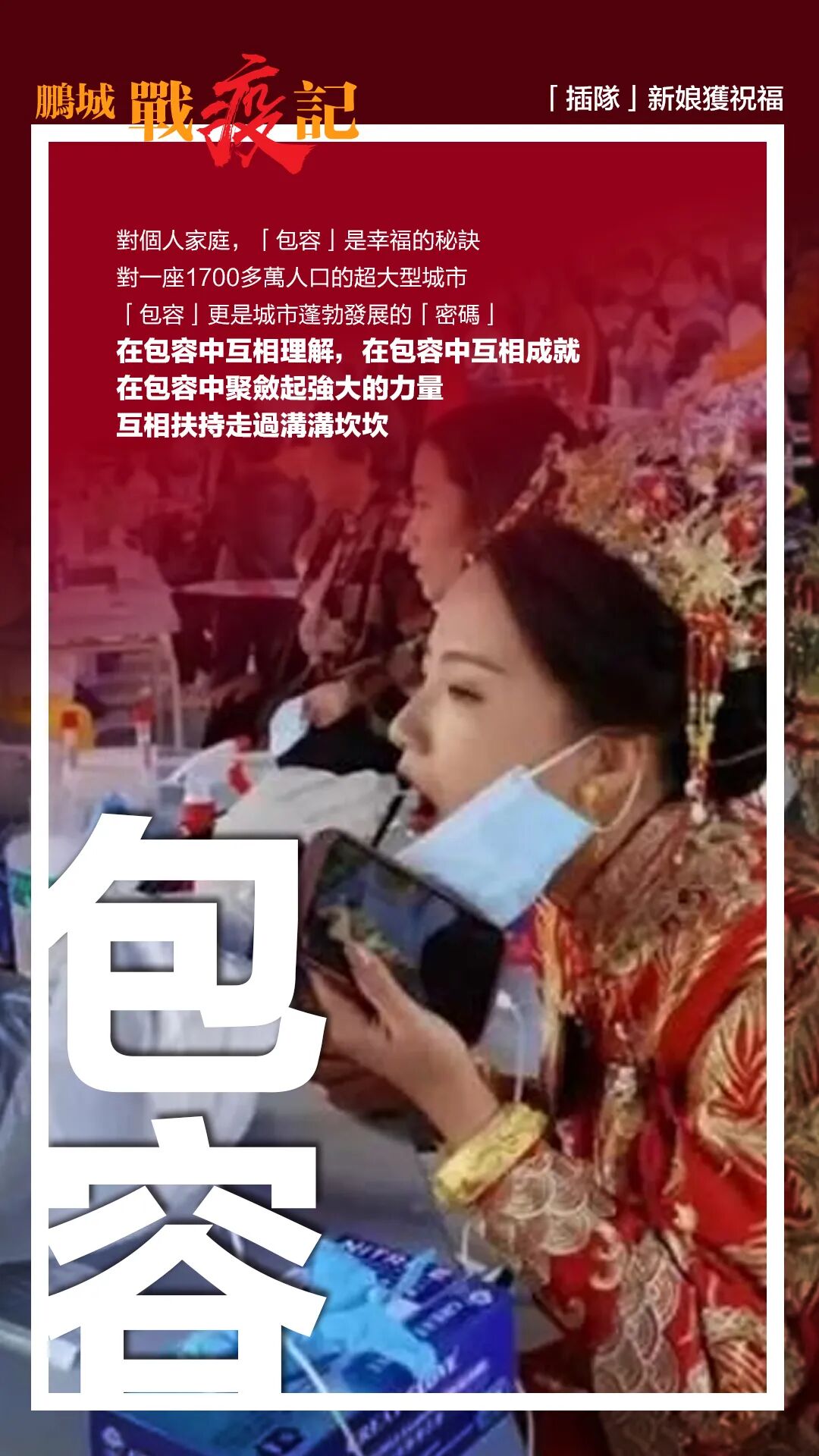防控疫情不是靠某一方面的力量就能单独完成的,打这种大仗、硬仗,最需要凝心聚力,形成合力。就在1月7日,一位新娘身着嫁衣排队接受核酸检测的图片迅速在网上传播。她在婚礼进行到一半时主动配合进行核酸检测,在工作人员的帮助下,通过绿色通道快速采样,顺利赶上婚礼仪式。据记者了解,为配合防疫,新郎新娘主动取消了宴请环节。让“我”凝聚成“我们”,人民群众的鼎力支持,是做好疫情防控的关键。这张“被全深圳祝福”的照片里,全景式地再现了抗“疫”过程中的鹏城。诸如此类的画面所映照的,正是千万深圳人心往一处想、劲往一处使。