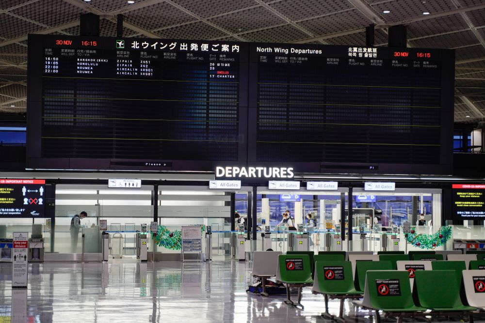 这是2021年11月30日拍摄的日本东京成田机场T1航站楼国际出发口。(新华社记者张笑宇摄)