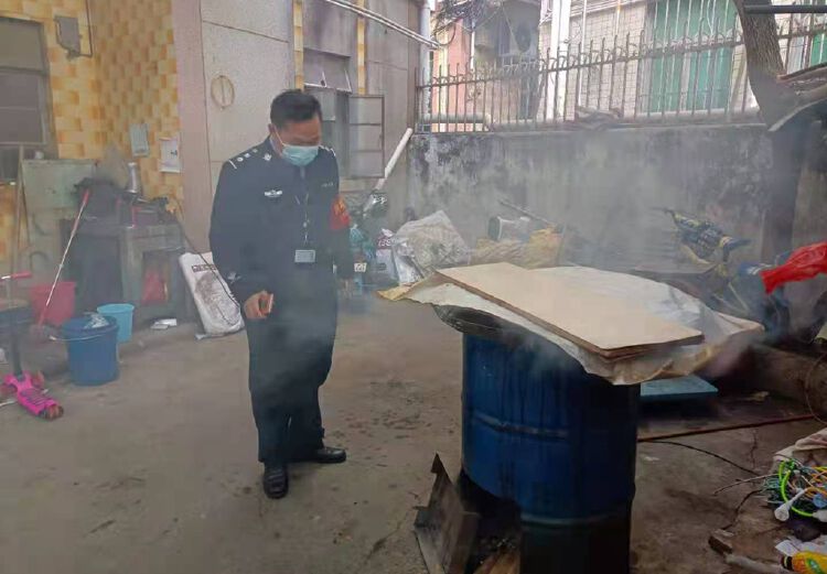 当日下午16时50分左右,红星网格巡查中队网格员何俊霖和何日娣在辖区进行安全巡查,经过红星社区蚝涌村一栋出租屋时,看到该出租屋院子突然冒起了浓烟。网格员立即上前了解情况,发现是用废弃铁桶制成的灶台,正用柴火在底下烧着,还冒着明显的火焰。灶台旁边还堆放了很多纸皮、木柴等易燃物品。浓烟滚滚,呛得过往的村民寸步难行,甚至不得不低头手捂着嘴,弯腰前行。