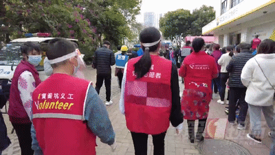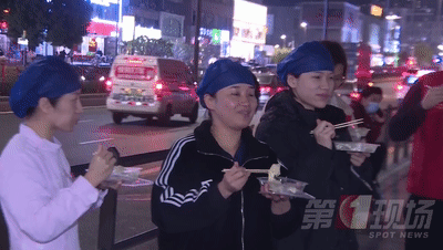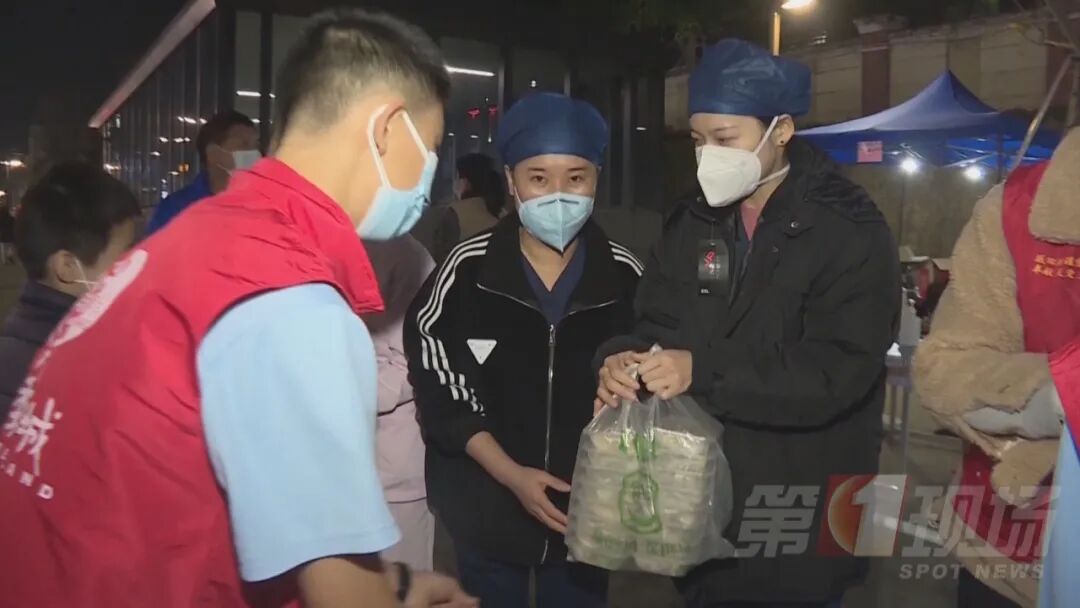 劳累了一天的医务人员和工作人员,看到学生们送来的爱心宵夜,纷纷给这些学生们竖起了大拇指。