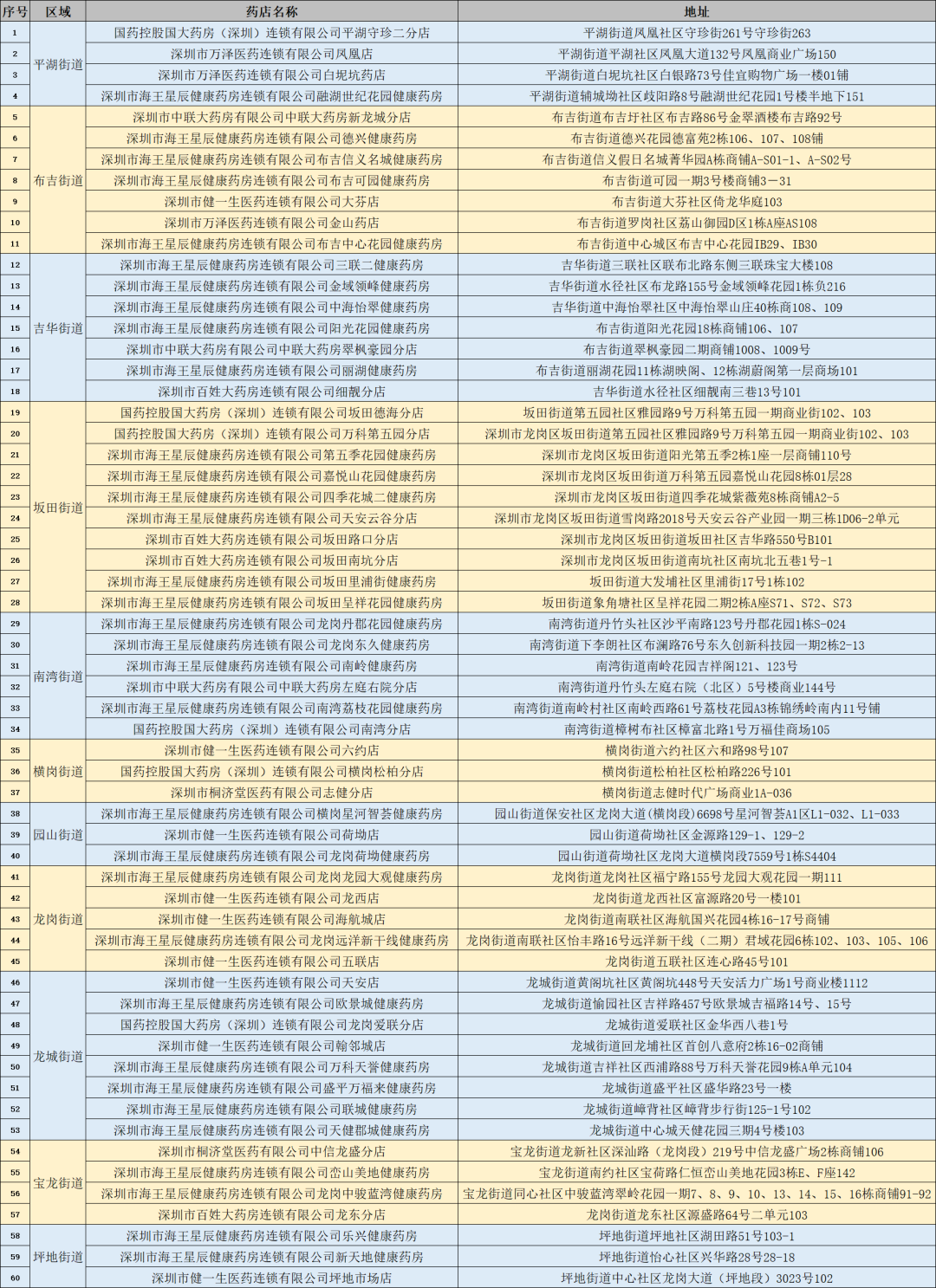 根据深圳市疫情防控需要,1月13日起,龙岗区在全区11个街道的60家指定药店销售39种感冒退热药品,其他药店暂停销售,有需要的市民可前往购买。