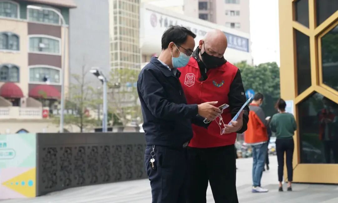 日前,家住大鹏新区大鹏办事处下沙社区的居民们发现,家门口的防疫卡点有一名身穿红马甲的外国友人,他不仅能说一口流利的中文,而且还能熟悉地帮街坊们测体温、查看行程码等。