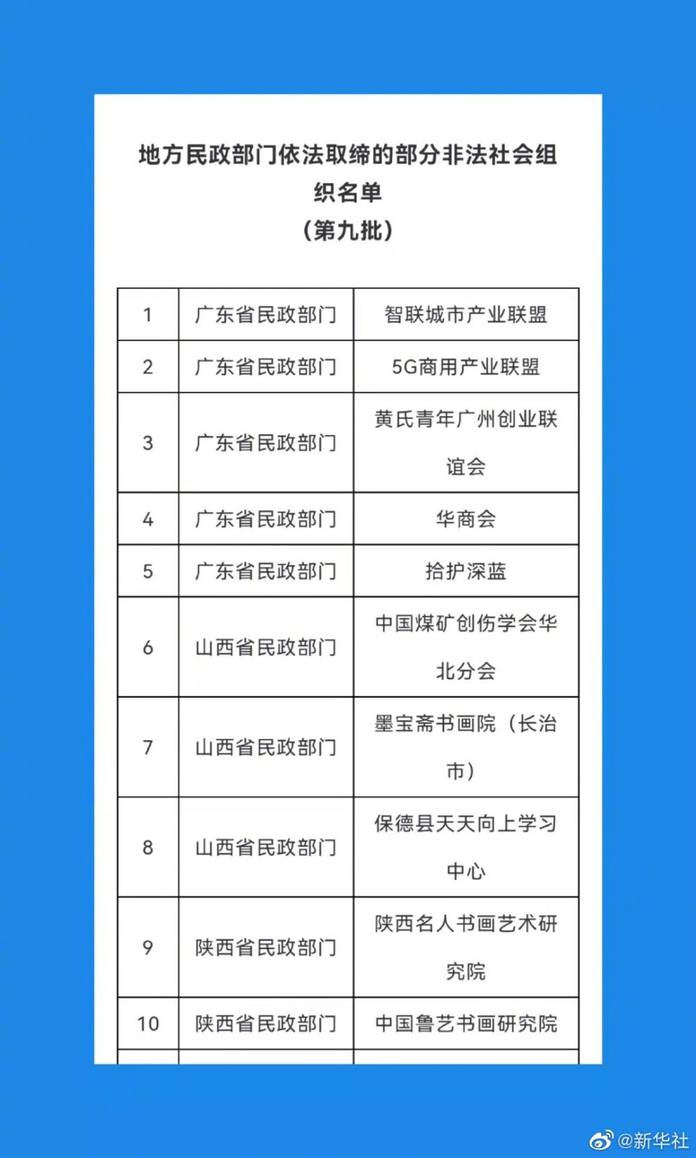 【民政部门取缔28家非法社会组织】民政部17日公布第九批地方民政部门依法取缔的部分非法社会组织名单。包括5G商用产业联盟、华商会等28家非法社会组织“上榜”。民政部再次提醒有关机构和社会公众,在与社会组织开展合作或参与其活动时,请通过“中国社会组织政务服务平台”(www.chinanpo.gov.cn)、“中国社会组织动态”政务微信(微信号:chinanpogov)核实其身份,避免上当受骗。同时,欢迎社会各界通过“中国社会组织政务服务平台”提供涉嫌非法社会组织活动线索。