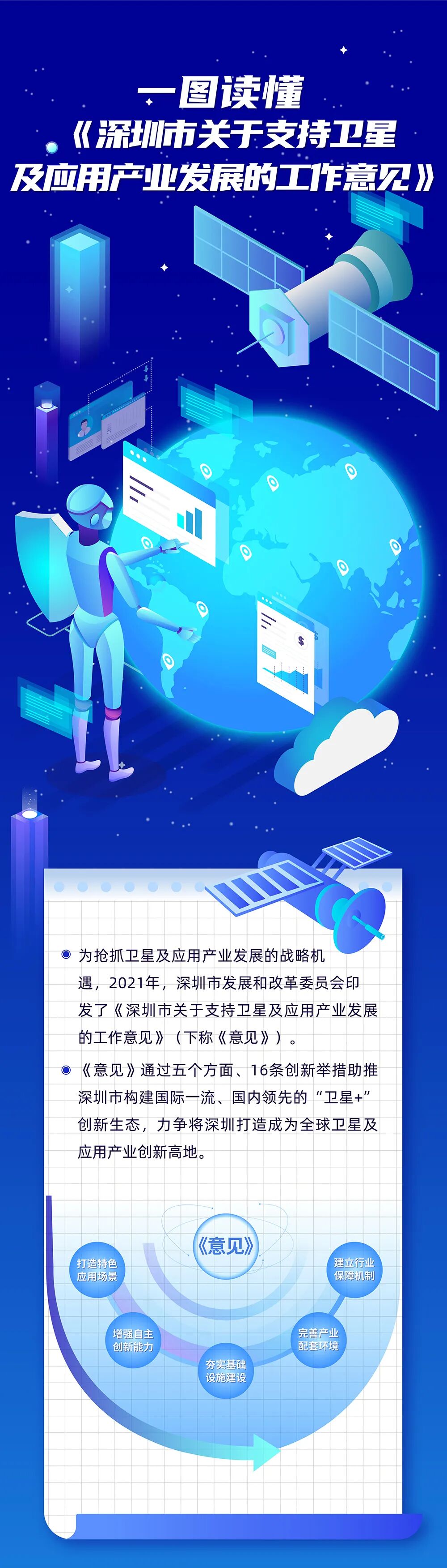 《意见》通过五个方面、16条创新举措助推深圳市构建国际一流、国内领先的“卫星+创新生态,力争将深圳打造成为全球卫星及应用产业创新高地。