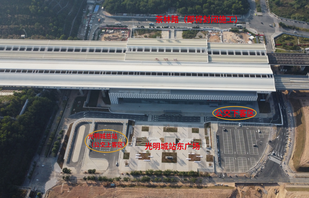 前方收到最新消息,因光明城站西侧茶林路即将封闭施工,城站东广场道路交通设施已建设完善。