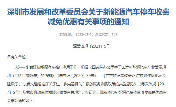 1月19日,记者从最新一期政府公报获悉,近日,深圳市发改委发布《关于新能源汽车停车收费减免优惠有关事项的通知》。