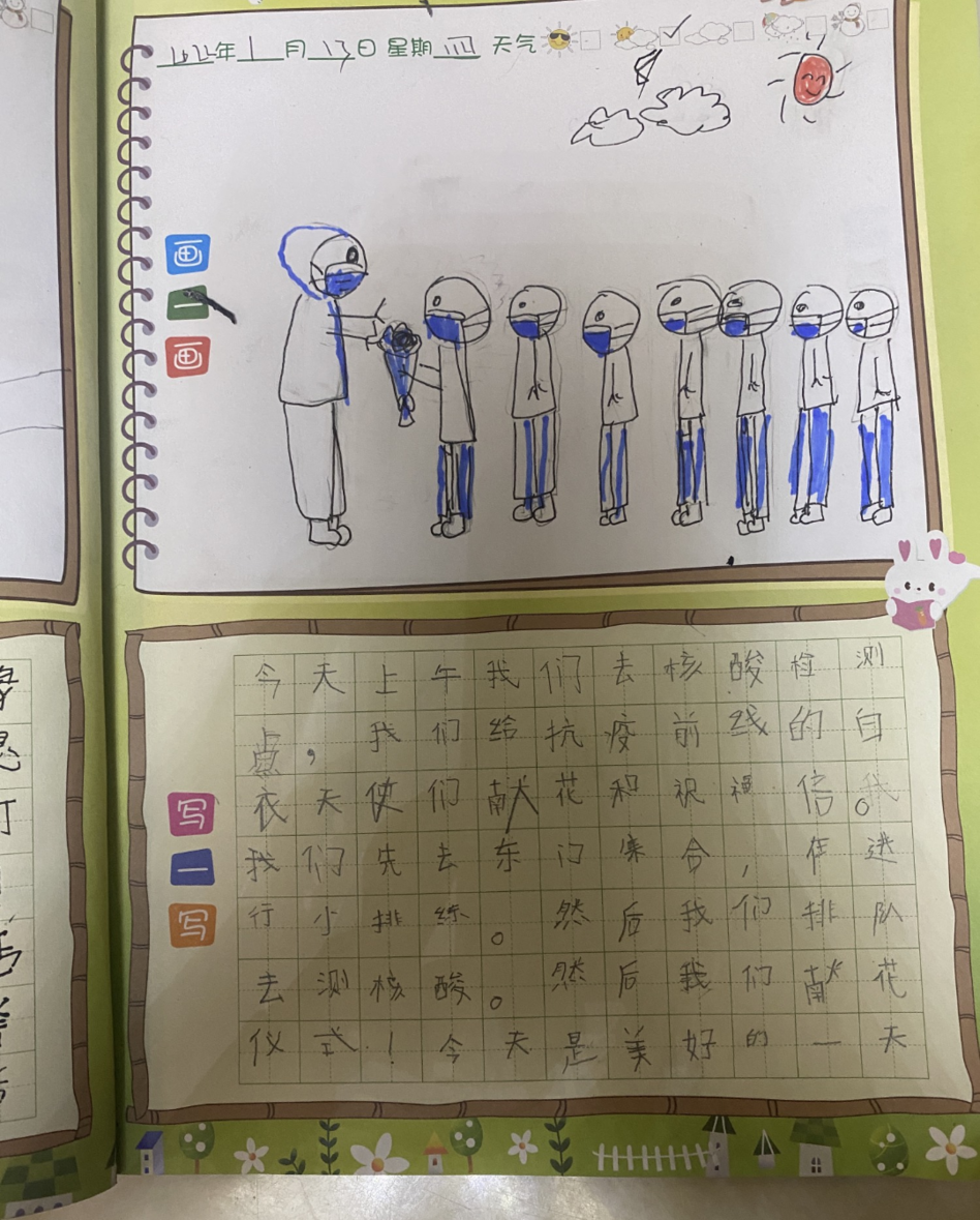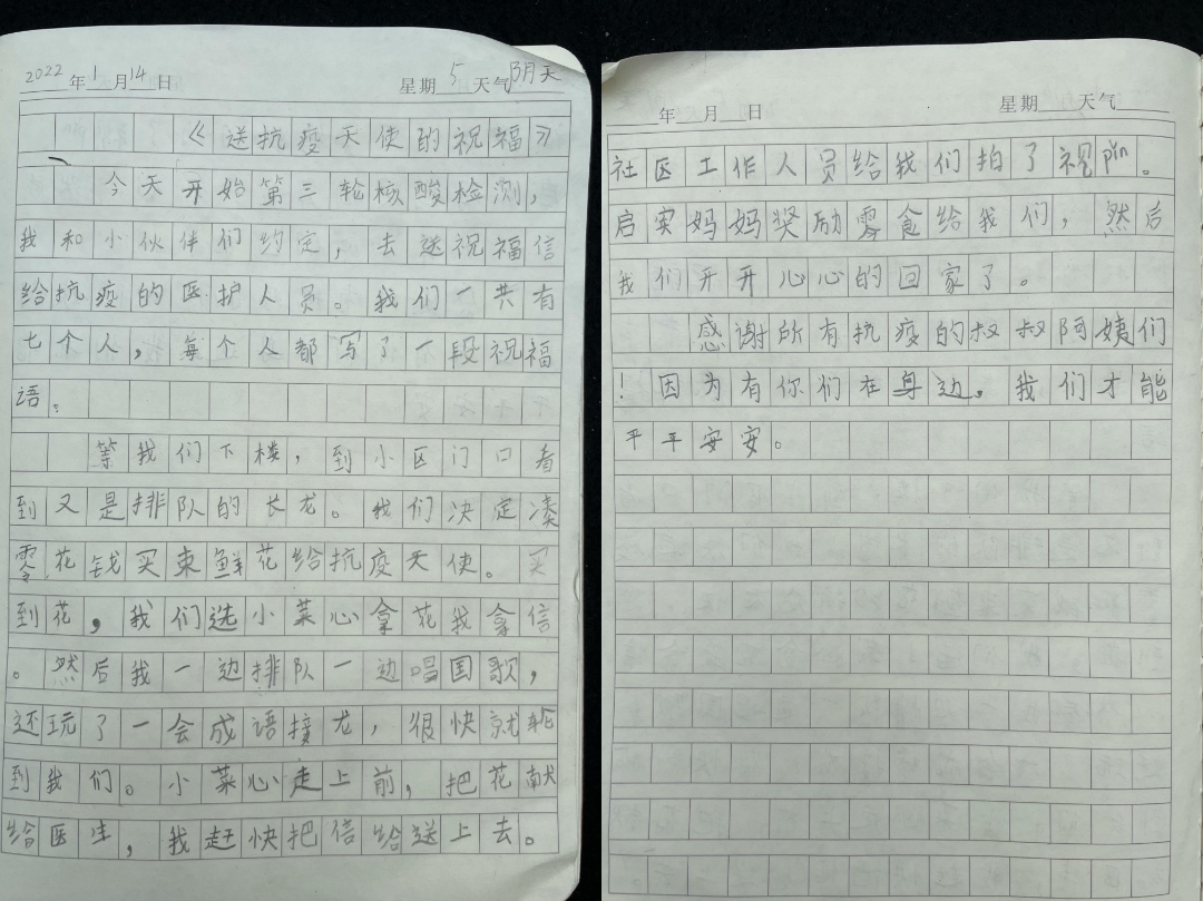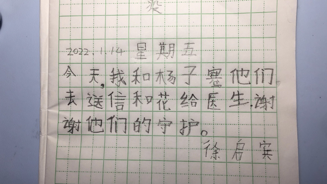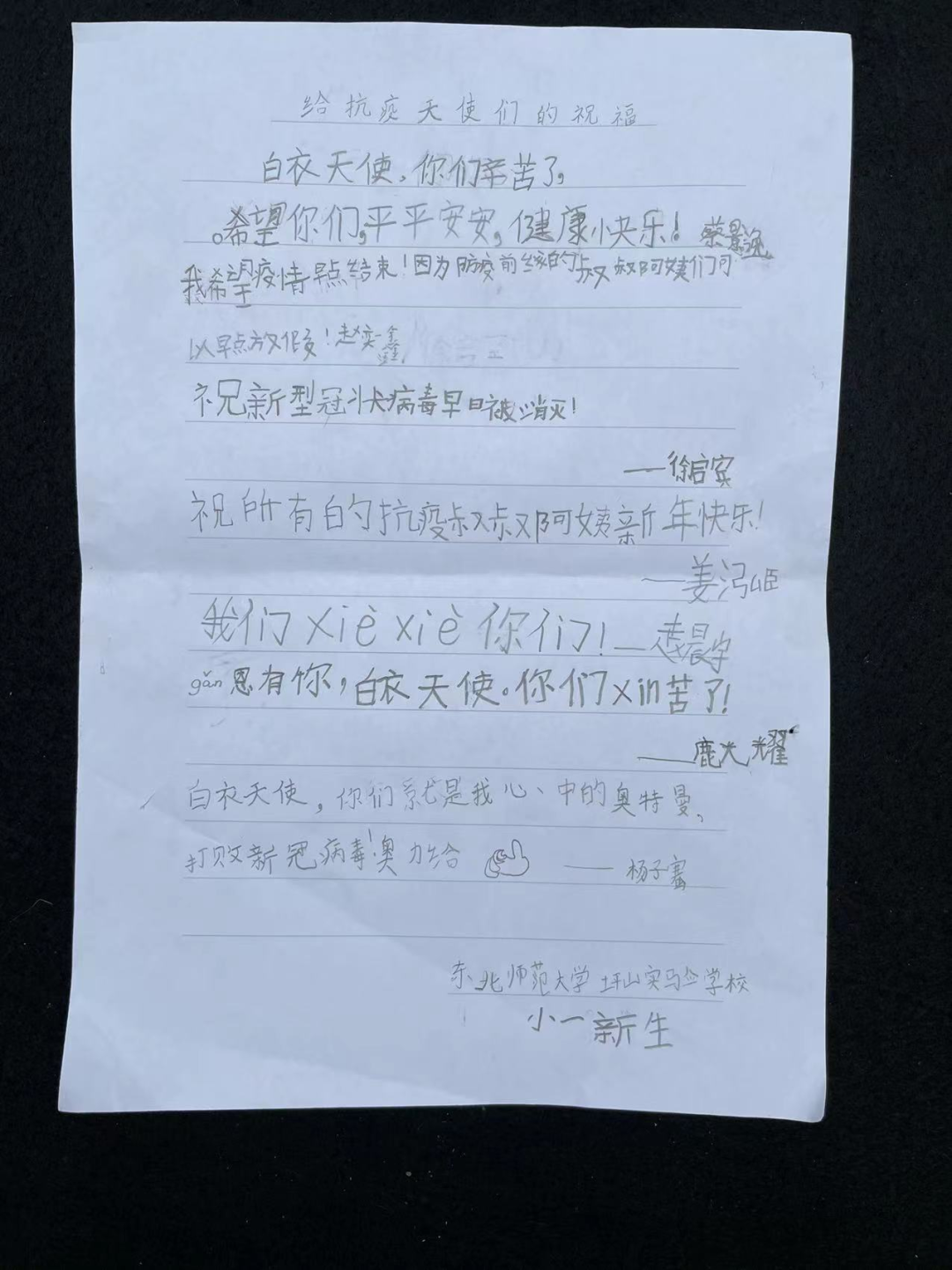 “白衣天使,你们辛苦了。希望你们平平安安,健康快乐!”“白衣天使,你们就是我心中的奥特曼,打败新冠病毒。奥力给!”……短短一封信,传递着浓浓温情。写完信之后,大家又拿出零花钱,为抗疫医护工作者准备了一束漂亮的鲜花。