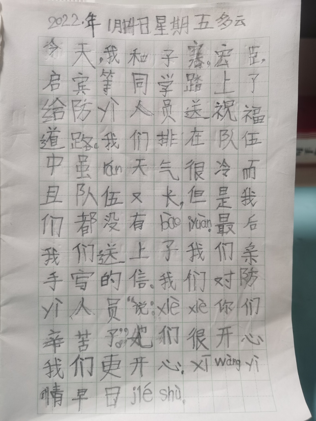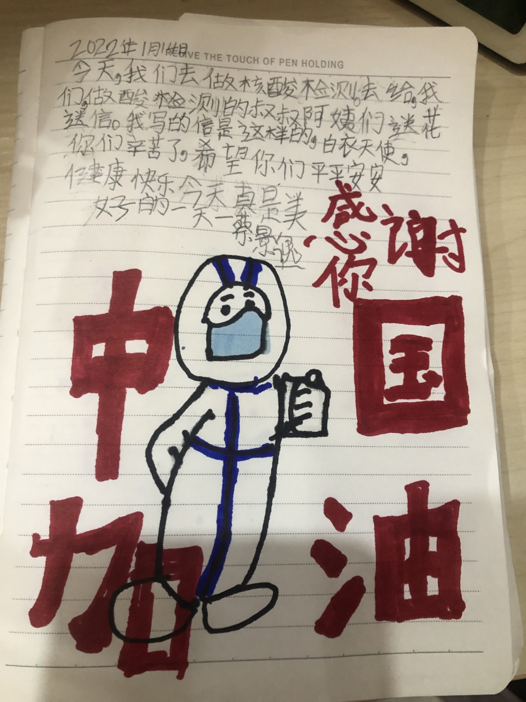 近日,坪山街道核酸检测点的医护人员,收到了一封笔迹稚嫩的来信,信件有汉字也有拼音,简短又童稚的话语背后饱含着真挚的感恩之心。