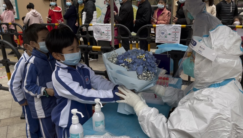“白衣天使们,希望你们平安健康,这是我们写的祝福信,请您收下。”送上信件和鲜花后,孩子们特意举起右手,向医护人员们敬礼致意。