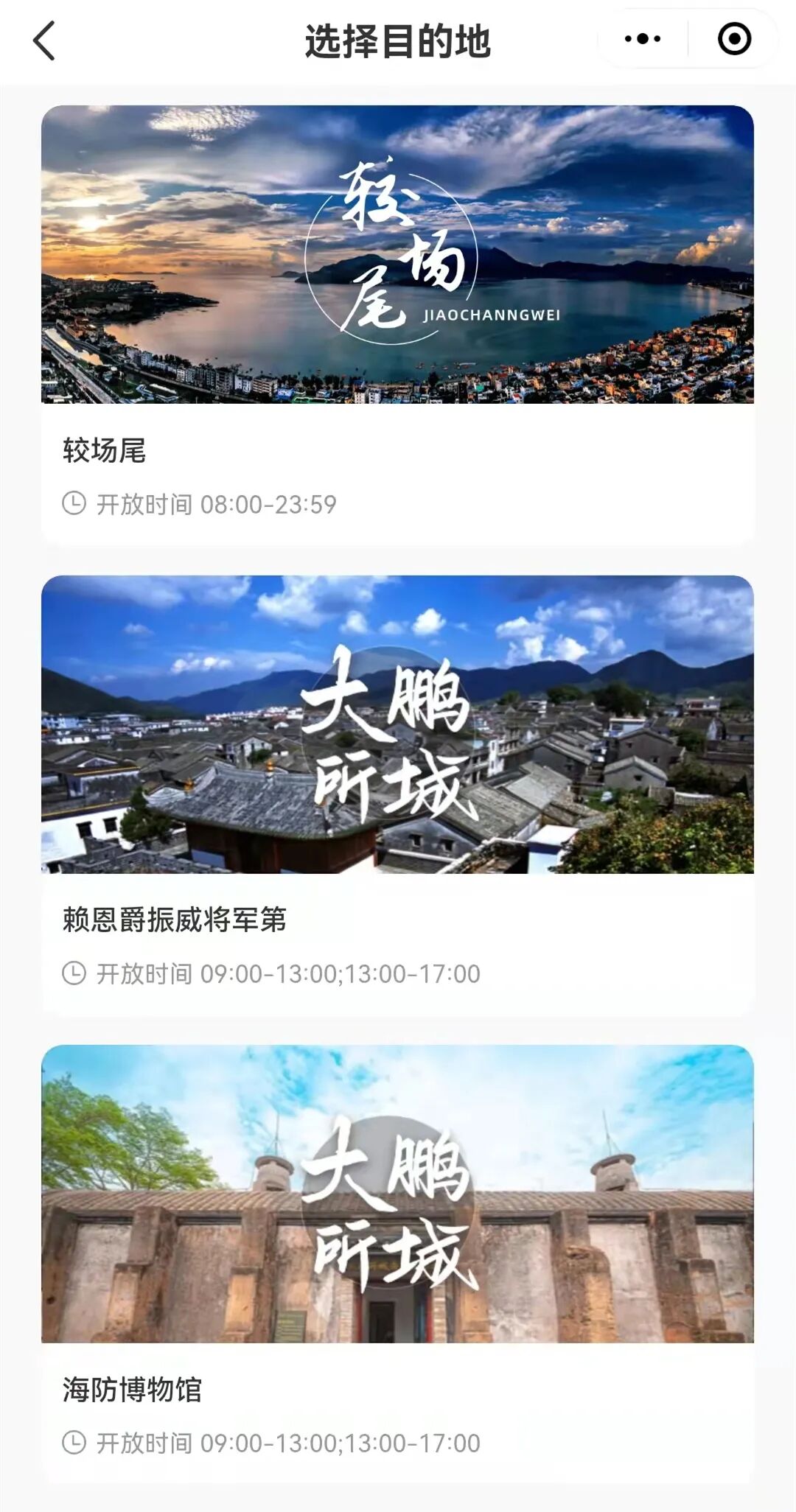 第一步:打开“约游大鹏”小程序,进入“首页”—点击“预约出行”,选择出行日期,点击“立即预约”,进入选择目的地,选择您要出行的片区景点。
