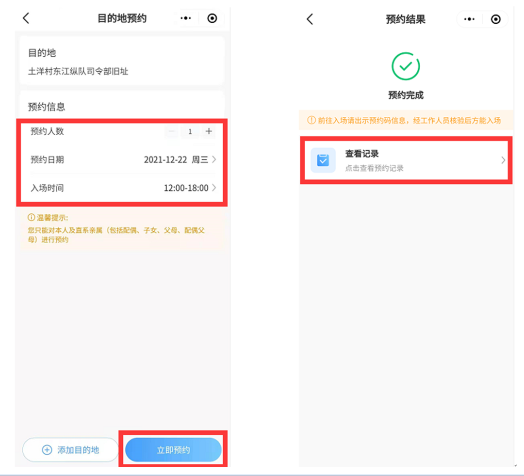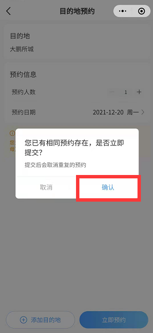 第二步:填写目的地预约信息,点击“立即预约”,预约完成。