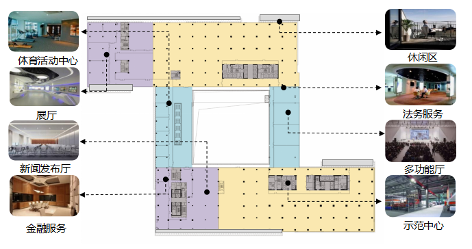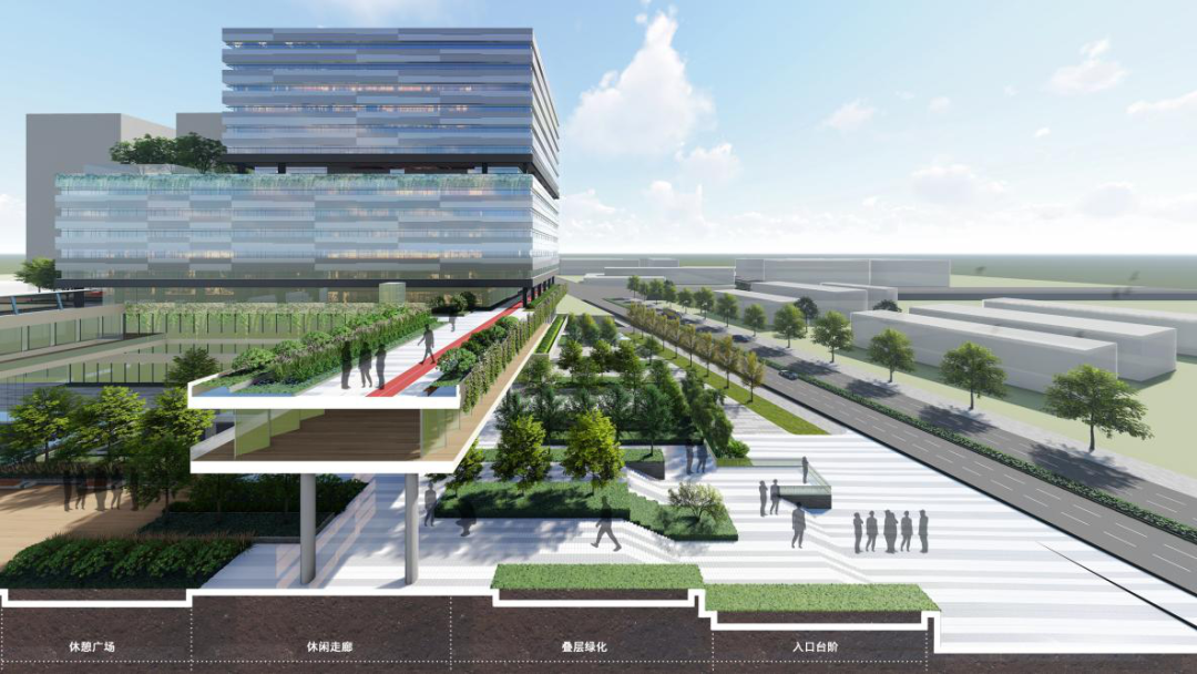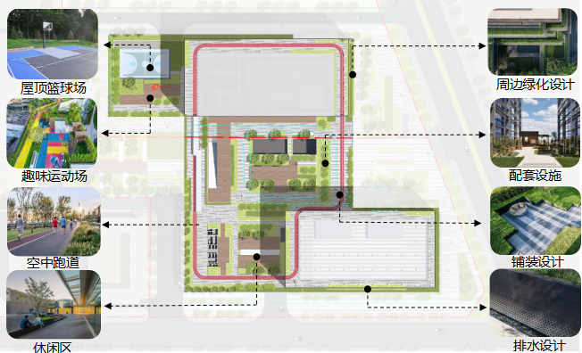 五层设置环形连通的架空层结合跑道、球场等运动场地,形成健康有活力的共享活力平台。