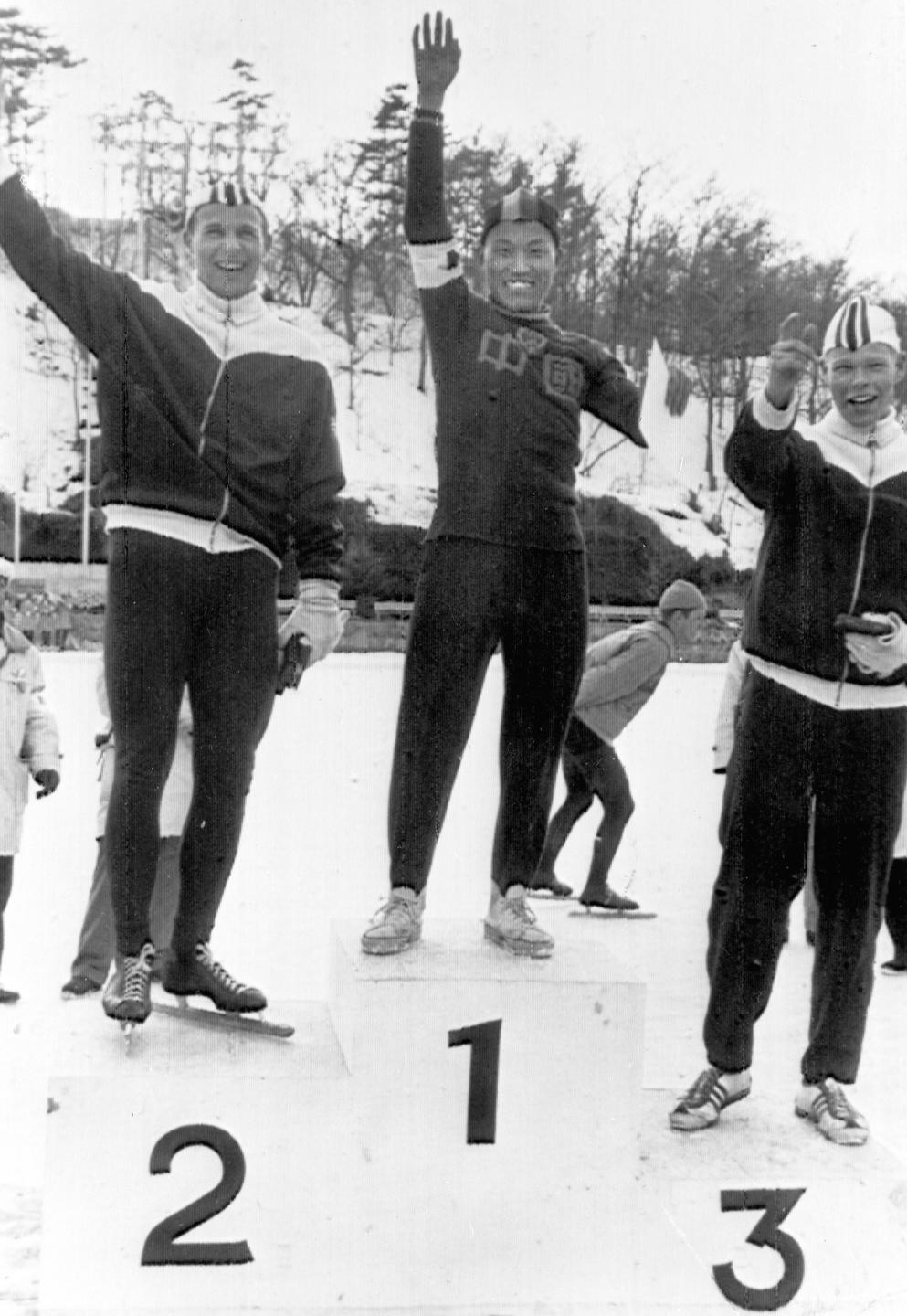 1963年2月24日,罗致焕(中)在日本举行的世界速度滑冰锦标赛男子1500米比赛中,以2分9秒2的优异成绩赢得了这个项目的世界冠军。这是中国运动员第一次取得冰上运动的单项世界冠军。新华社发(资料照片)