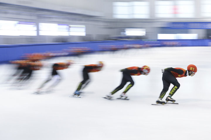 1月10日,在被誉为“冬奥冠军之乡”的黑龙江省七台河市,七台河职业学院短道速滑训练中心的孩子们在训练中。新华社记者张涛摄