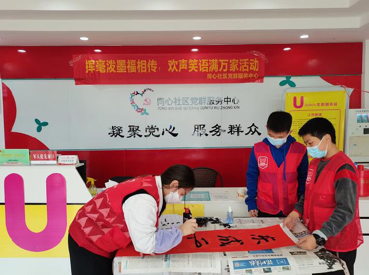 当日上午,该社区党群服务中心音乐悦耳、楹联飘香,大红的春联、福字喜气洋洋,浓浓的年味扑面而至,洋溢着一派节日的喜庆气氛,“挥毫泼墨福相传,欢声笑语满万家”义写春联活动正进行得如火如荼。