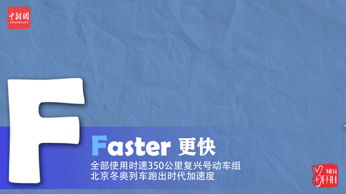 因为创新(Innovation)的加持,“水立方”转化为“冰立方”、“冰丝带”碳排放趋近于零;以中国传统红灯笼为原型,寓意喜悦(Joy)的吉祥物雪容融;时速350公里的冬奥复兴号,跑出更快(Faster)时代速度......