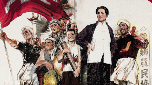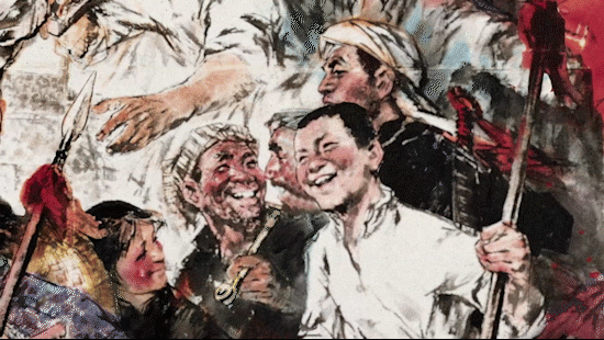 毛泽东身边有背着大刀的农民干部,或高举旗帜或手挽铜锣的青年农友,还有面露幸福笑容的农家少年。