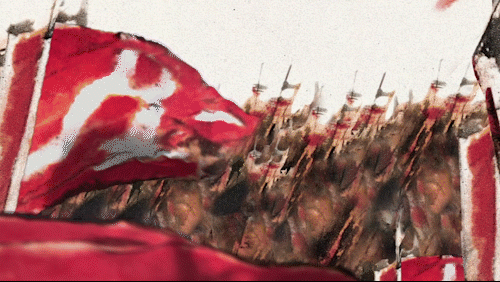 画作四周有序分布着此起彼伏的漫卷红旗,让画面丰富而热烈。