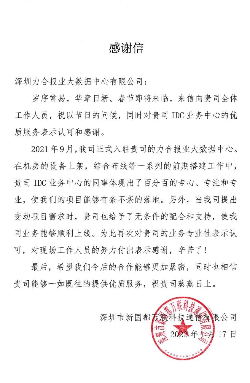 2022年初,力合报业大数据中心顺利完成新国都二期配电改造及客户设备交付工作,得到了客户的强烈认可并收到来自客户的感谢信。
