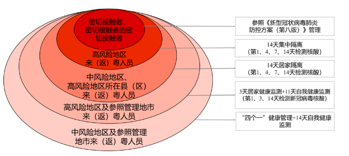 三、3天居家健康监测+11天自我健康监测(第1、3、14天检测新冠病毒核酸):有高风险地区所在地市(包括参照管理地市)旅居史来(返)粤人员。