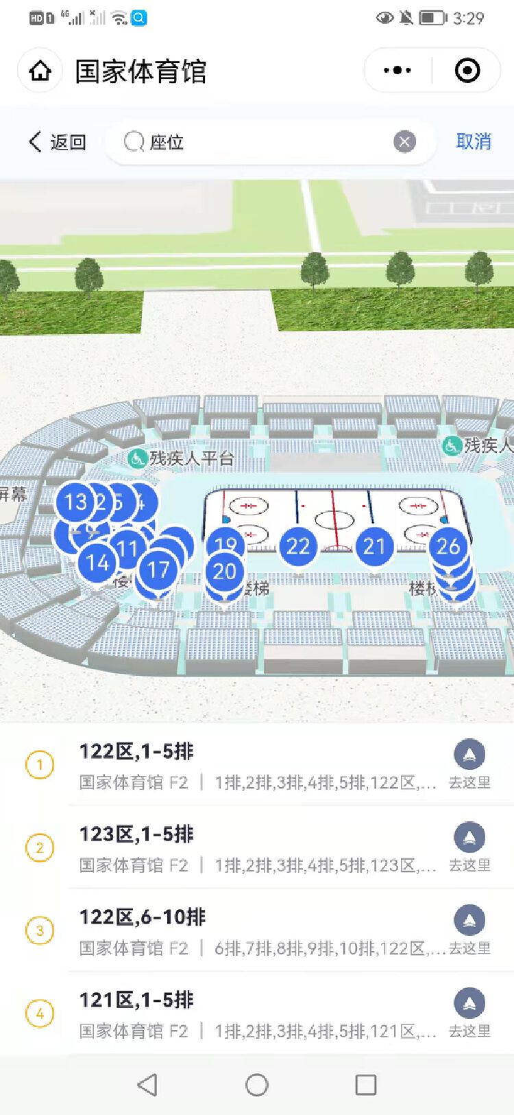 目前,“冰之帆”观众座椅升级改造工程已经完工,国家体育馆微信公众号的“智慧坐席管理系统”小程序也正式上线。观众只需打开国家体育馆微信公众号就可以访问导航系统,导航地图使用了3D仿真建筑模型且支持360°自由旋转缩放,点击建筑体,即可切换进入体育馆室内地图界面。
