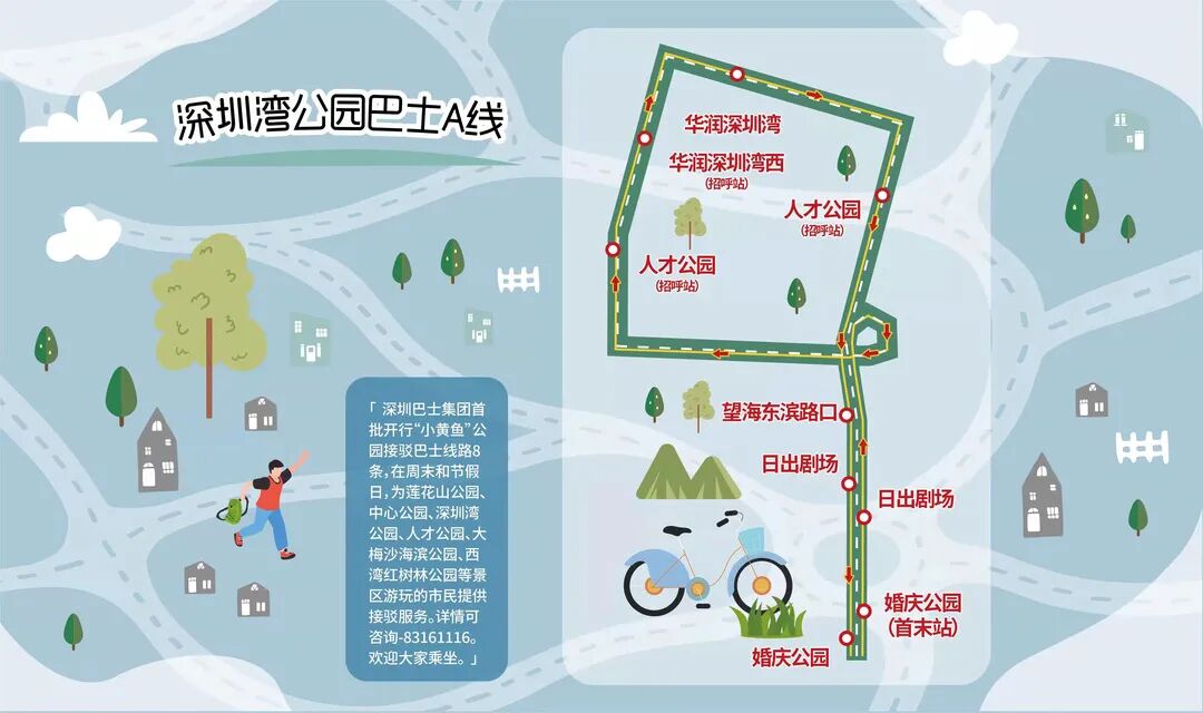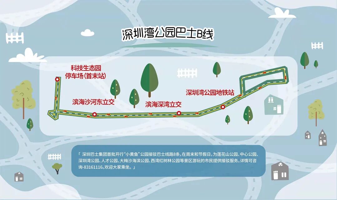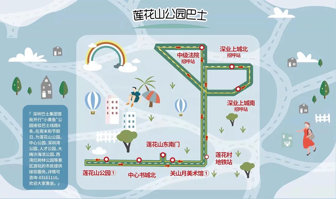 公共交通服务关键在于满足市民日益多样化的出行需求。结合深圳市“留深过大年”的号召,配合公园停车场预约制的推行,在市交通运输局、市城市管理和综合执法局的指导支持下,1月30日,深圳巴士集团开通试运营8条“小黄鱼”公园接驳巴士(1月31日正式运营),服务时间从上午9点到下午6点,专线覆盖福田、南山、宝安和盐田4个行政区,主要为到莲花山公园、中心公园、深圳湾公园、盐田海滨假日公园等景区游玩的市民,提供从社区到景区、从景区到商圈的公交接驳服务,让广大市民朋友周末的公园休闲之旅不再被“停车难”而困扰。