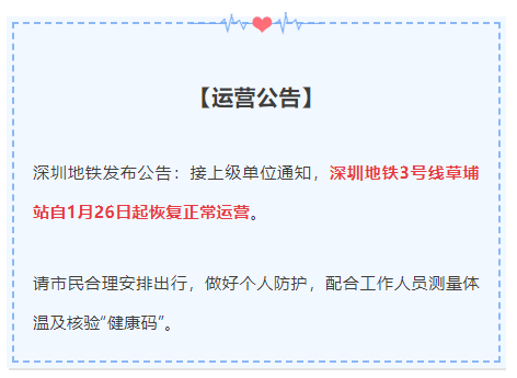 1月26日起,深圳地铁3号线草埔站恢复正常运营。请市民合理安排出行,做好个人防护,配合工作人员测量体温及核验“健康码”。