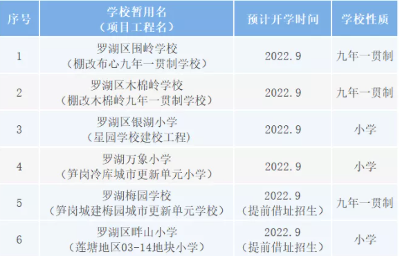 1月24日,罗湖区教育局公示围岭学校、木棉岭学校、银湖小学、万象小学、梅园学校、畔山小学等6所新建学校学区划分,据悉,上述学校将在2022年9月至2023年9月开办。