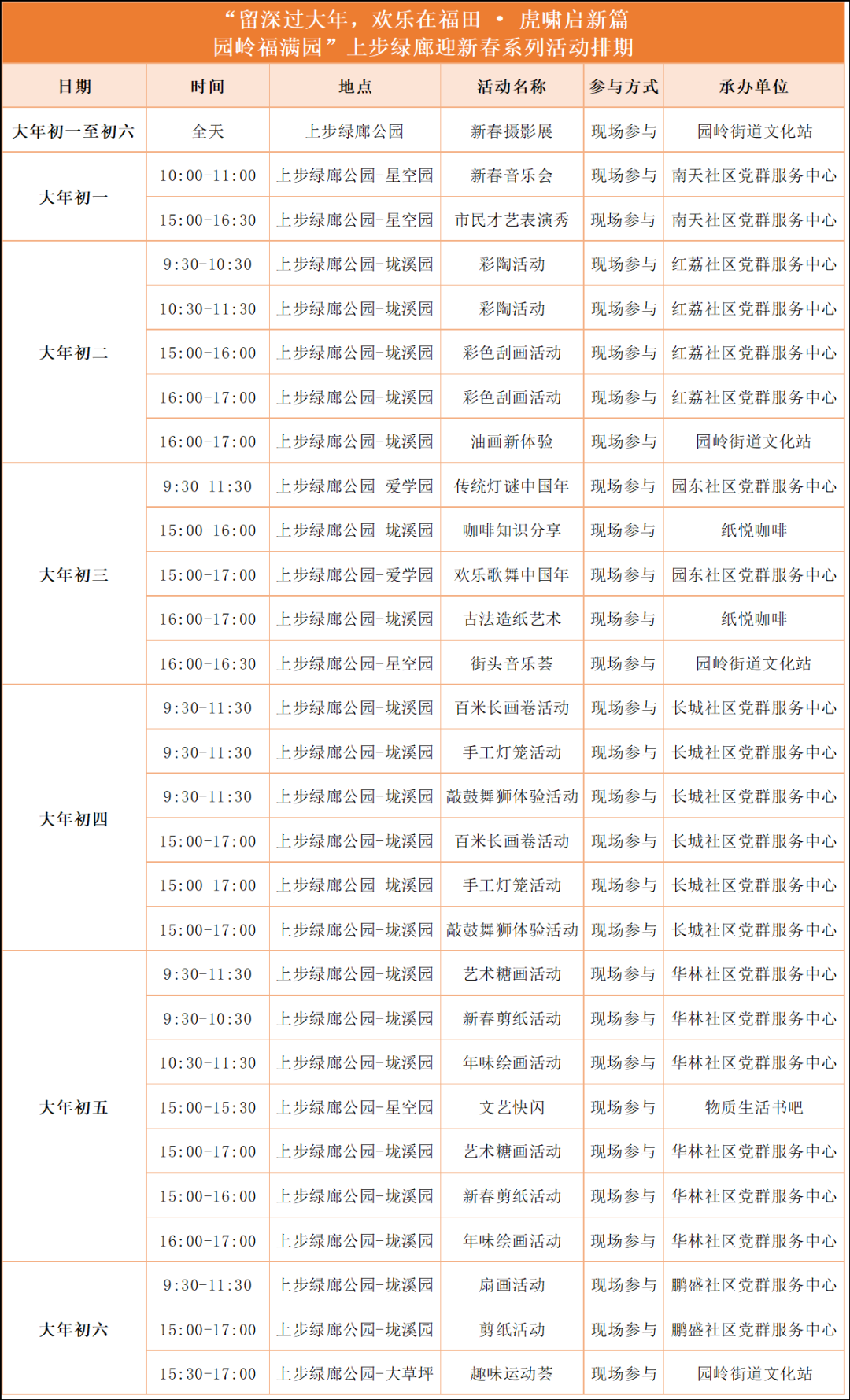 除了可以逛公园之外,园岭街道还为大家准备了新春活动大礼包!初一到初六,园岭不打烊,上步绿廊美,新春欢乐多。