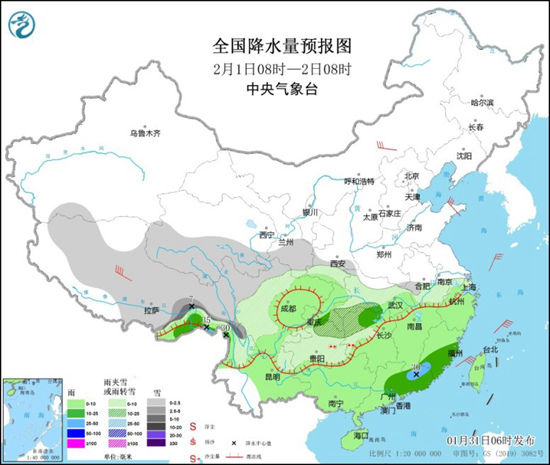 2月1日,雨雪范围扩大,强度将有所加强,预计西藏大部、青海南部、西北地区东南部、川西高原、贵州大部、湖南西部和北部、湖北大部、安徽南部等地部分地区有小到中雪或雨夹雪,其中,西藏东南部、云南西北部等地局地有大雪(5~7毫米)。江南大部、西南地区东部和南部、华南等地部分地区有小到中雨,其中,福建东南部、广东东北部等地部分地区有大雨(25~35毫米)。贵州东部、湖南西南部局地有冻雨。