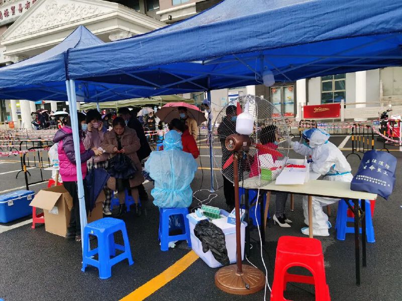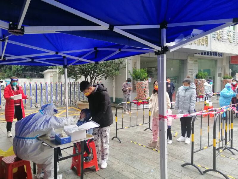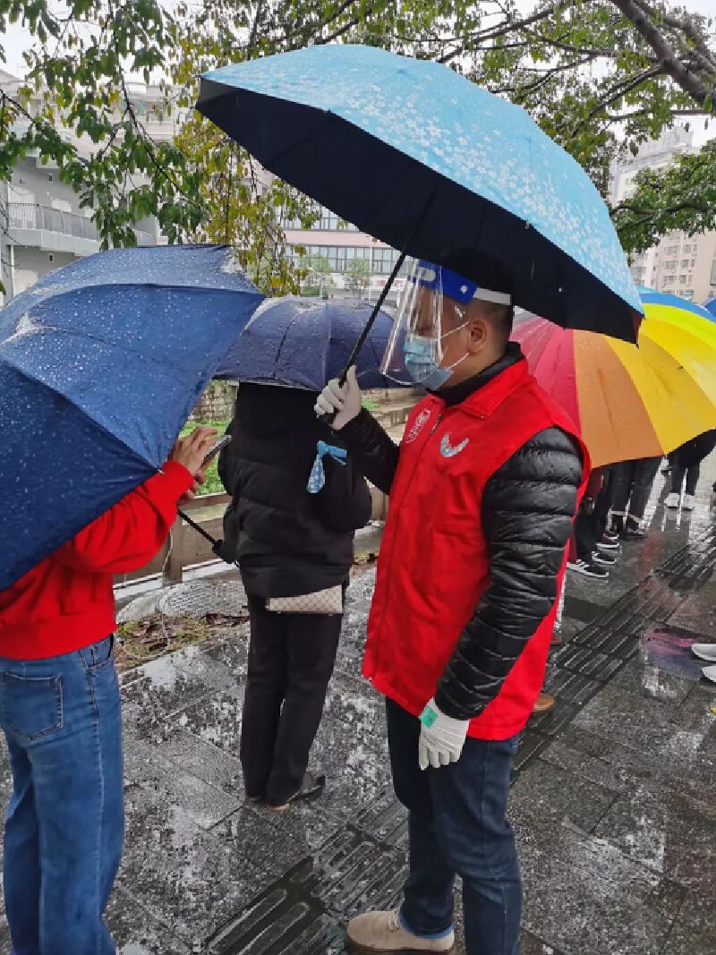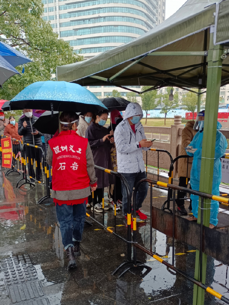 从1月31日起,石岩街道在全域开展全员核酸检测。2月1日上午,石岩街道迎来一场大雨。雨中,石岩各个核酸检测点有序进行核酸采集工作,市民撑着伞耐心排队检测,工作人员也想尽办法找来雨棚和雨伞——有的工作人员从后备箱拿出自己的雨伞分给市民,有的则当起行走的“遮雨棚”,撑着伞将市民“护送”到采集区域。