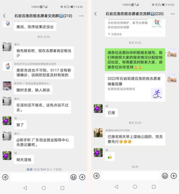 除夕当晚,一条特殊的信息在深圳各个志愿者群里转发着:“各位志愿者朋友,目前,石岩正在招募应急防疫志愿者,如果您也想参与公益志愿服务,为疫情防控贡献自己的一份力量,请扫码加入‘石岩应急防疫志愿者交流群’……”一时间,来自全市各区的志愿者们纷纷加入石岩应急防疫志愿者群,并相继在群内报名。