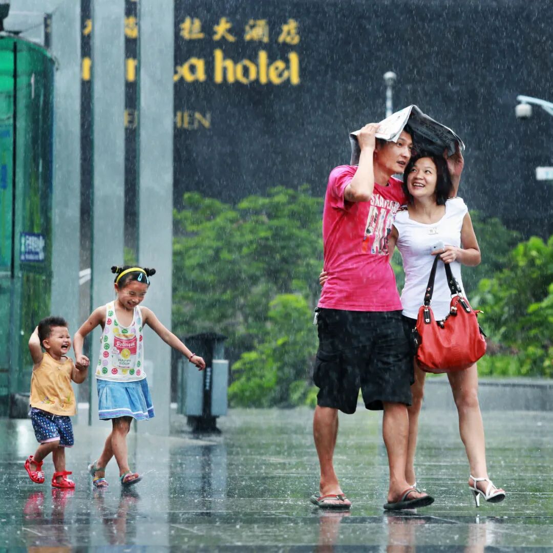 大雨倾下的深圳街头,大人们共用一份报挡风和雨,