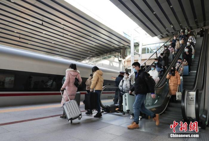 1月28日,旅客在北京西站进站乘车。随着春节临近,铁路部门迎来节前客流高峰。 中新社记者 贾天勇 摄