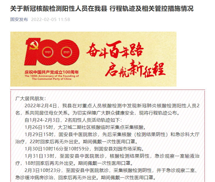 2022年2月4日,我县在对重点人员核酸检测中发现新冠肺炎核酸检测阳性人员2名,系共同居住母女关系。为切实保障广大群众健康安全,现将行程轨迹公布。