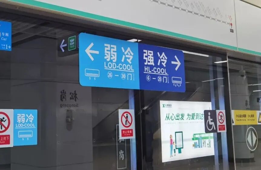 目前深圳地铁设置了“同车不同温”车厢,在乘坐地铁时可以根据标识的箭头指引(强冷、弱冷)选择合适的车厢哦~
