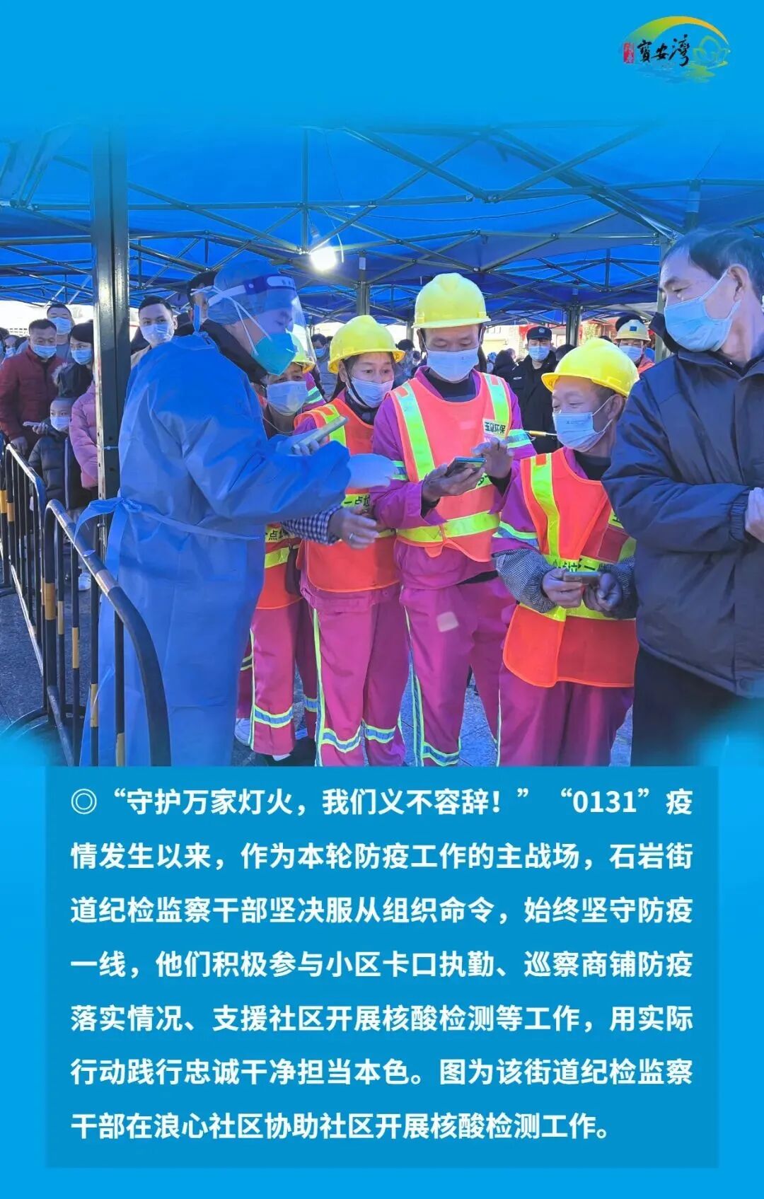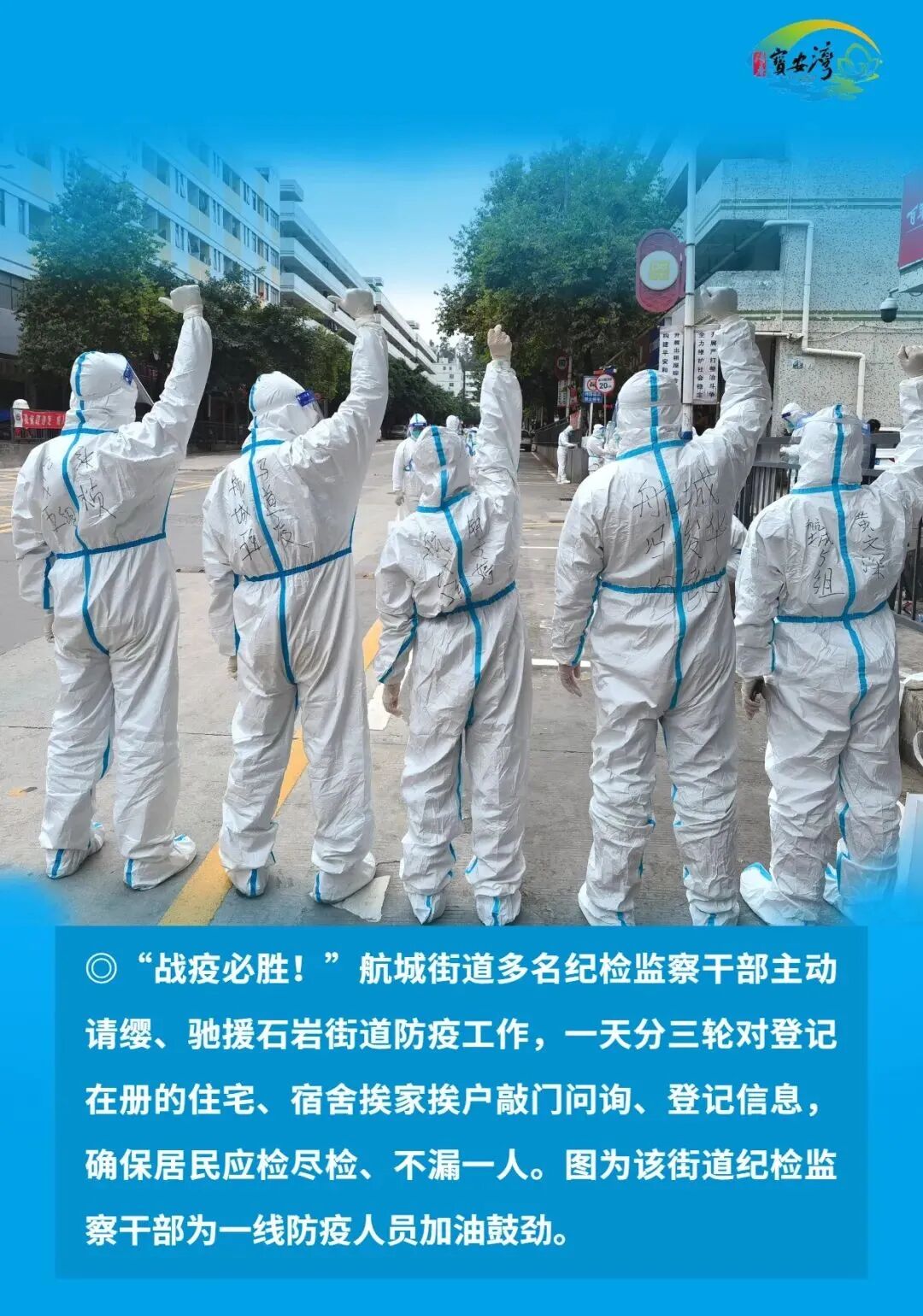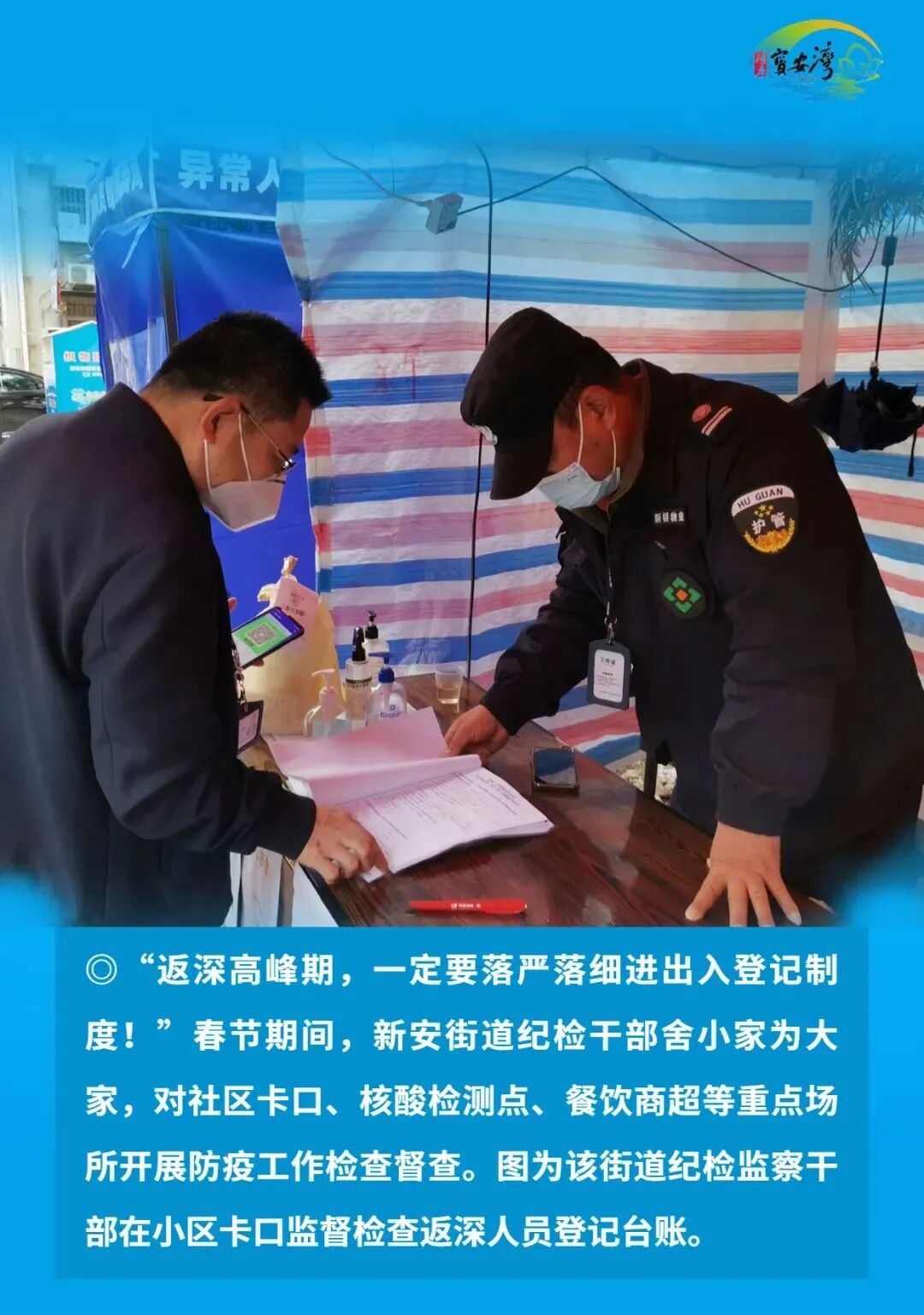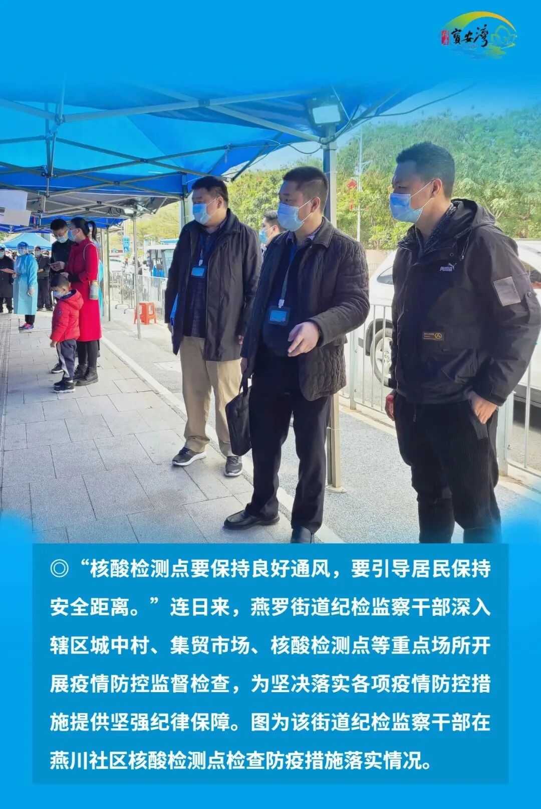 宝安区纪检监察干部毫不放松抓好常态化疫情防控,始终在战“疫”一线争分夺秒、披荆斩棘、奋勇前进,以“无我”状态为宝安战疫贡献力量,切实筑牢疫情防线,坚决以硬干部硬作风硬措施打赢这场疫情防控硬仗。