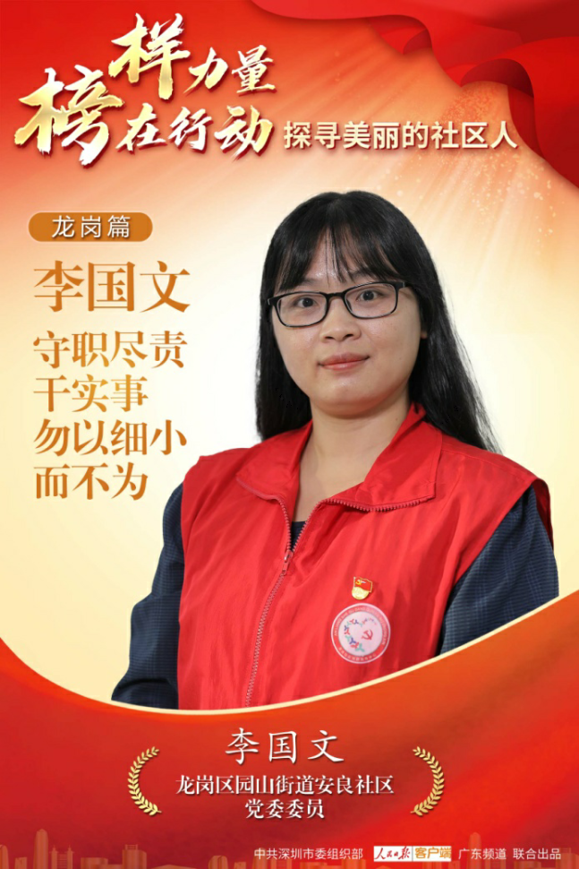 安良社区是2021年深圳“5·21”疫情的主战场之一。疫情防控期间,从核酸检测到八村居民的日常物资保障服务,李国文事无巨细,一一沟通协调。为满足每个核酸检测点的服务要求,李国文根据场地、检测方式有针对性地配置充足的人员;来开放行条的居民,情绪通常比较激动,这时她就要不断地安抚、耐心解释,根据不同的状况,向未予放行的居民细心解答、说明情况。